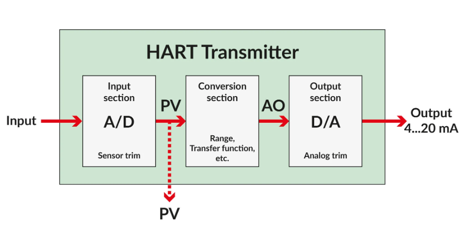 Tín hiệu đo thực tế (áp suất, nhiệt độ, lưu lượng, v.v.) được đưa vào bộ chuyển đổi A/D, nơi tín hiệu analog được chuyển thành dạng số. Đại lượng thường được sử dụng nhất là Primary Variable (PV). Khối đầu vào có thể được điều chỉnh (trim) thông qua chức năng sensor trim của transmitter. - Khối xử lý và chuyển đổi số: