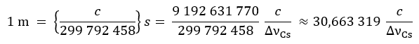 Định nghĩa này bao hàm hệ thứ chính xác c = 299 792 458 m s-1. Bằng cách đảo về hệ thức này, mét được biểu diễn theo các hằng số c và ΔνCs.