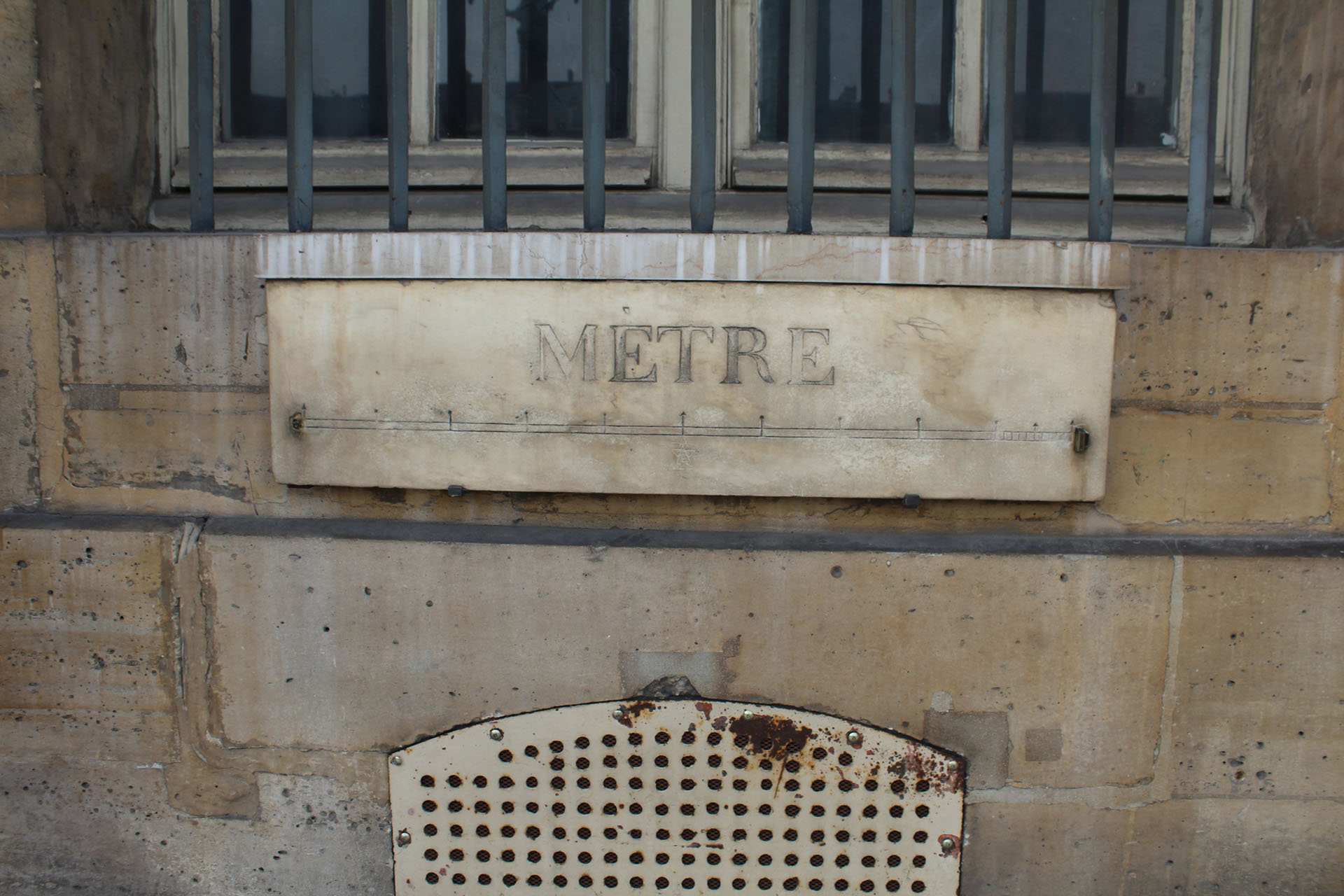 Hình 1. Một trong những thước đo mét tiêu chuẩn cuối cùng còn sót lại bằng đá cẩm thạch, trên đó có khắc một thanh ngang kèm theo chữ “MÈTRE”, dặt tại cửa sổ tầng trệt của Bộ Tư pháp Cộng Hòa Pháp ở thành phố Paris.